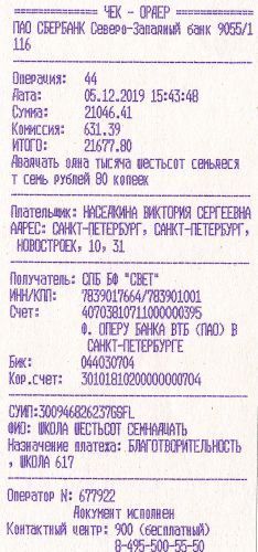Собранные средства были направлены в Санкт-Петербургский благотворительный фонд помощи детям с онкозаболеваниями «СВЕТ». Всего было переведено в фонд 21677 рублей 80 копеек. Деньги в фонд переводила председатель Совета обучающихся Наседкина Виктория, ученица 11л класса.