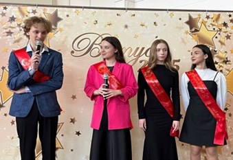 Директор школы, Смирнова Ольга Игоревна, поздравила всех ребят, успешно окончивших 11 класс, отметила высокобалльные результаты ЕГЭ, поздравила стобалльников - Арутюнян Зарину (химия) и Смирнова Илью (информатика), а также золотых и серебряных медалистов, олимпиадников, которые получили почётные знаки.