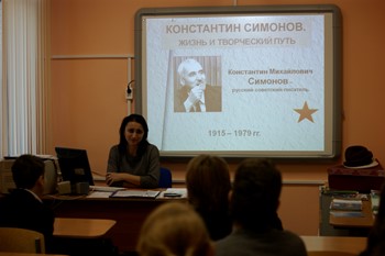 В 2015 году исполняется 100 лет со дня рождения замечательного русского поэта, писателя, драматурга, литературного и общественного деятеля, участника Великой Отечественной войны Константина Симонова. И наша школа не могла оставить без внимания это событие. 20 октября по всей школе прошли классные часы, посвященные этой памятной дате.
