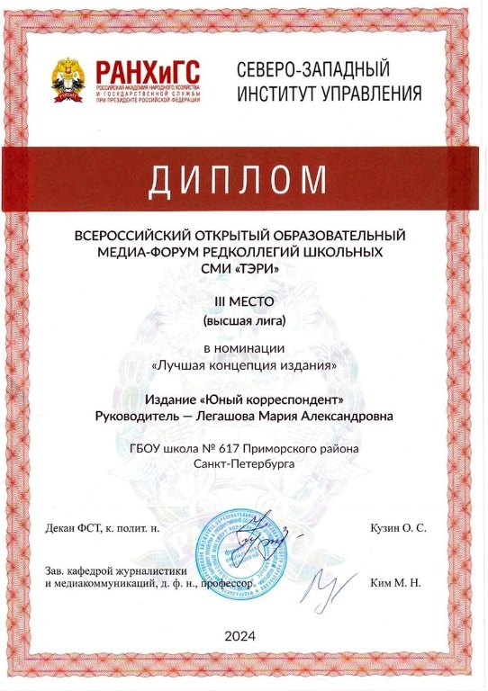 Школьная газета "Юный корреспондент" заняла III место в номинации "Лучшая концепция издания" на Всероссийском образовательном медиа-форуме школьных СМИ.
