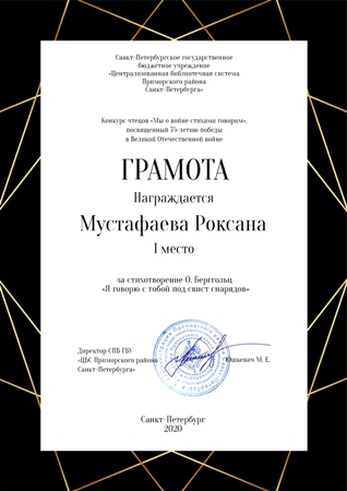 Активное участие в нем приняли ребята из школы №617, жюри высоко оценила прекрасное исполнение стихотворения Ольги Берггольц «Я говорю с тобой под свист снарядов», которое исполнила Мустафаева Роксана, она заняла 1 место.