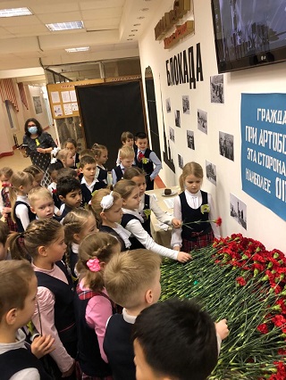В фойе школы можно увидеть исторические блокадные фотографии, пайку блокадного хлеба и свечи памяти. Уроки Мужества о бессмертном подвиге ленинградцев продолжились общей радиолинейкой и Минутой молчания.