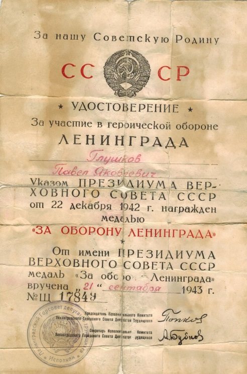 Мой прадедушка Глушков Павел Яковлевич родился 11 июня 1918 в деревне Юрьево, Кировской области. Учился в школе. В 16 лет уехал учиться в город Владивосток. Закончил там бухгалтерские курсы, а затем переехал в Тамбов, где закончил военное училище. С малолетства играл на баяне, участвовал в самодеятельности, а вскоре началась война. Прадед принимал участие в обороне Москвы, за оборону Ленинграда в 1942 году награжден медалью. В 1944 году познакомился с моей прабабушкой Екатериной Никифоровной, которая перенесла все тяготы войны в блокадном Ленинграде. Вскоре они поженились. До 1959 года был в звании майор. Умер дедушка 15 июля 1996 года в возрасте 78 лет.
