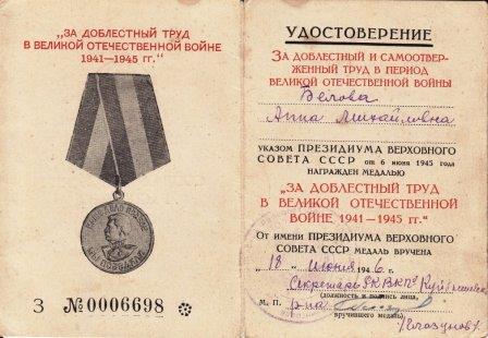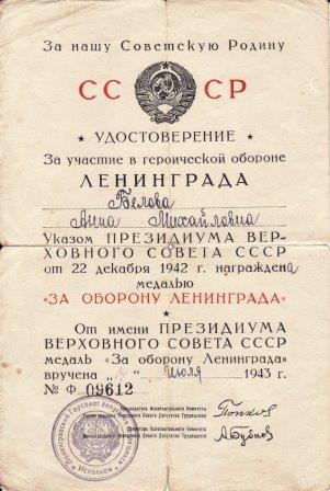 В начале 1942 года была направлена на работу санитаркой во 2-ю Детскую поликлинику. Санитары обходили квартиры и улицы города, искали больных и ослабевших от голода детей. Их лечили, кормили, ставили на ноги и отправляли из города туда, куда не дошла война. Очень много детей и взрослых умерло от голода и холода, санитары их собирали и отвозили для захоронения. Также приходилось при бомбёжках дежурить на крышах и тушить зажигательные бомбы (“зажигалки”). Это была тяжёлая и страшная работа. Уже в декабре 1942 года Анну Михайловну за участие в героической обороне города наградили медалью “За оборону Ленинграда”. За самоотверженный труд также награждена медалью “За доблестный труд в Великой Отечественной войне 1941-1945 г”