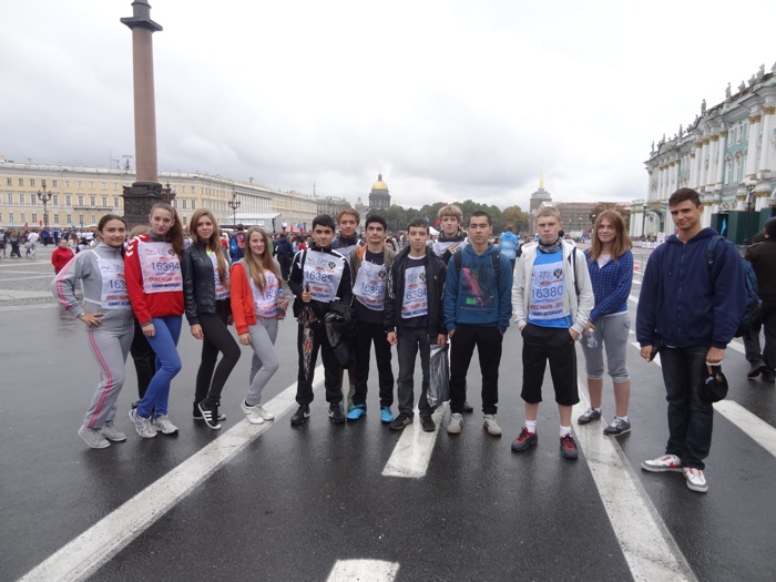 2 сентября 2013 года в 12 часов дня в девятый раз был дан старт самому массовому летнему спортивному мероприятию Всероссийскому дню бега – «Кросс Нации - 2013». Старт былтдан на Дворцовой площади и далее участники проследовали по маршруту: Дворцовая площадь - Дворцовый проезд – Дворцовый мост-Биржевая площадь – Биржевой мост - Кронверкская набережная– Троицкий мост – Дворцовая набережная- Дворцовый проезд - Дворцовая площадь. Общая протяженность трассы составляет 5 км. Наша школа представляла Приморский район в количестве 40 человек.