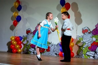 С улыбкой на лице провожали со сцены ученики начальной школы, занимающиеся в музыкальном театре «Радуга» подарили песню «Золотая свадьба», сопровождаемую танцем.