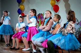 С улыбкой на лице провожали со сцены ученики начальной школы, занимающиеся в музыкальном театре «Радуга» подарили песню «Золотая свадьба», сопровождаемую танцем.