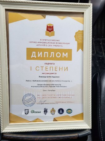 20 апреля прошла XI Всероссийская научно-инновационная конференция «Открой в себе ученого» при поддержке Санкт-Петербургского государственного технологического университета, Балтийского государственного технического университета «ВОЕНМЕХ» им. Д. Ф. Устинова. Успешо пройдя заочный тур, на очный этап был приглашен ученик 3а класса Плачинда Артем. Работы участников оценивались экспертным жюри (доктора наук, кандидаты наук, профессора, доценты, преподаватели ведущих вузов Санкт-Петербурга). Поздравляем Артема за ПОБЕДУ на конференции. Он представил свое исследование «Необъявленная война или как спастись от микробов». Желаем дальнейших интересных открытий и новых идей для исследования мира!