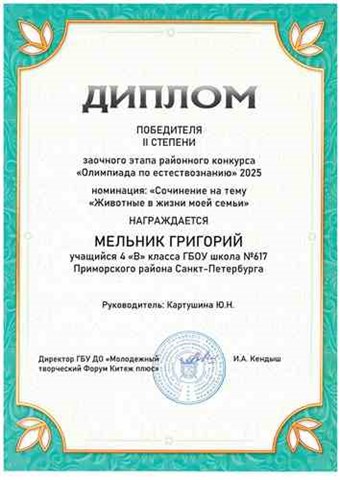 - Мельник Григорий, 4в класс - Диплом победителя 2 степени