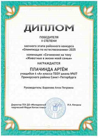 - Плачинда Артем, 4а класс - Диплом победителя 2 степени