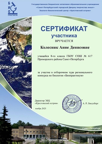 Ученица 8м класса Колесник Анна стала призером конкурса БИОПРАКТИКУМ. Поздравляем Анну с маленькой победой! Анна будет внесена в базу талантливых детей ВГИР.