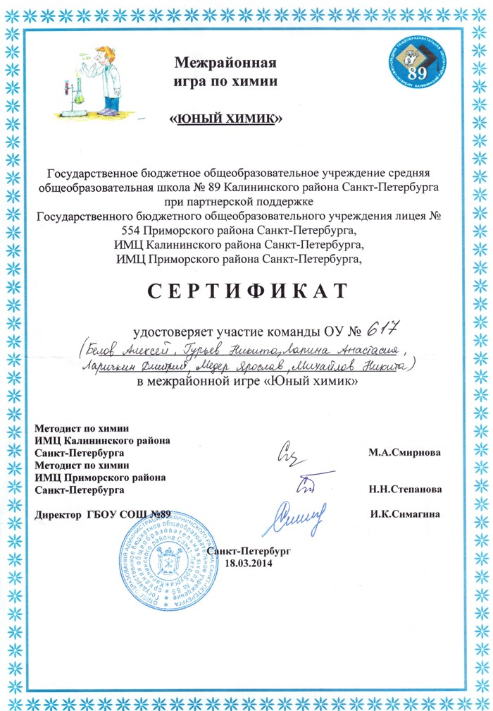 Команда нашей школы приняла участие в межрайонной игре "Юный химик", которая проводилась в школе № 89 Калининского района.