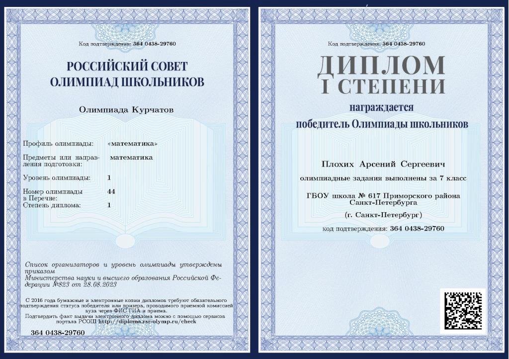 | Плохих Арсений | 7л1 | Олимпиада Курчатов | математика |