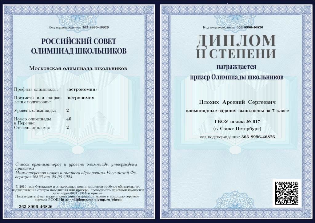 | Плохих Арсений | 7л1 | Московская олимпиада школьников | астрономия |