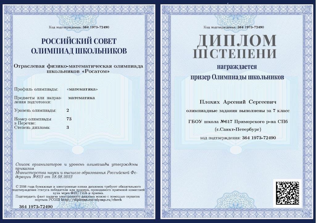 | Плохих Арсений | 7л1 | Отраслевая физ-мат олимпиада школьников «Росатом» | математика |