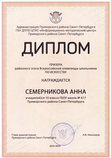 По окончании 11 класса Анна одновременно с аттестатом получила сертификат о первой профессии "Лаборант химического анализа". Также она успешно участвовала во Всероссийской олимпиаде школьников. Имеет дипломы по Экологии, Искусству (МХК), Основам безопасности и защиты Родины.
