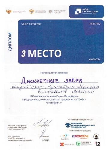 - 3 место – «Дискретные звери», школа № 617 Приморского района Санкт-Петербурга (11ли класс: Амдий Эрнест, Самохвалов Арсений, Нуштайкин Максим)