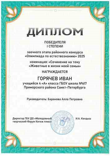 - Горячев Иван, 4а класс - Диплом победителя 1 степени