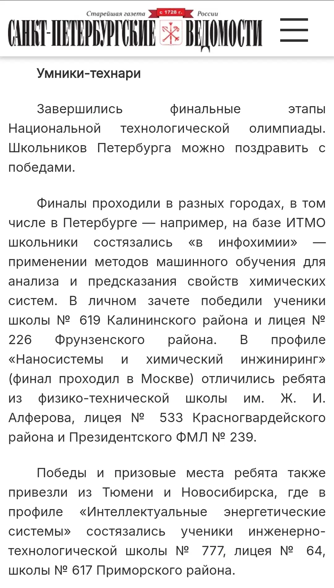 Подведены итоги финала профиля «Интеллектуальные энергетические системы» Национальной технологической олимпиады. Соревнования проходили на площадках Новосибирского и Тюменского государственных университетов. География финалистов обширна, но для нас особенно важно, что достойно представили Санкт-Петербург и наш Приморский район ребятя из школ № 617 и 64.