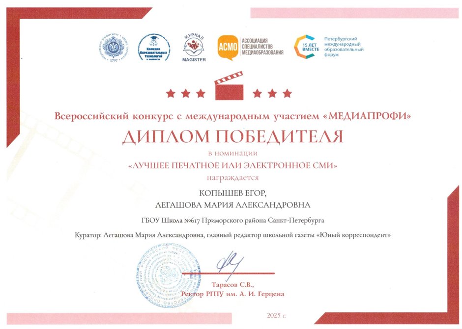 Главный редактор школьной газеты - Легашова Мария Александровна