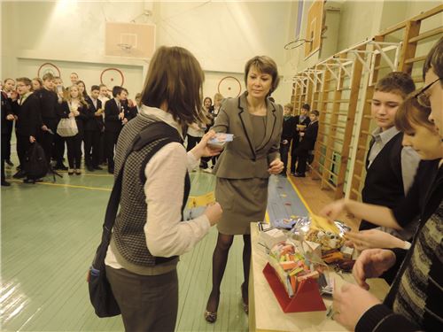На переменах у наших школьников была прекрасная возможность поучаствовать в праздничной лотерее. Однако в жизни ничего не дается просто так, и этому школа тоже учит нас. Поэтому каждый, кто желал принять в ней участие, должен был заработать билет, обменяв его на пять пятёрок. Вы скажете: «Это же так легко!» Но, как призналась Алёна Васильева, это очень непросто. Ведь, чтобы получить пять, нужно постараться, а где-то даже посоревноваться со своими одноклассниками. Как же ребята бились за свои пятёрки! Ещё никогда так усердно не поднимали они руки на уроках, не ходили за учителем с просьбой спросить их ещё, чтобы вместо «4» получить «5»! И вот, в ходе напряжённой борьбы за «5» многие получили эти заветные билеты.