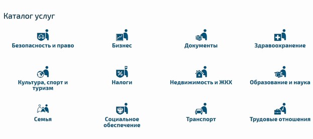 Первый вариант – непосредственно каталог услуг. Вместо длинного списка, который был размещен на старой версии Портала, пользователь видит компактный перечень из 12 разделов, каждый из которых содержит собственный список услуг, в котором несложно разобраться.