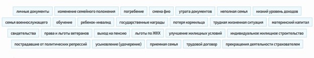 Третий вариант поиска услуг – по ключевым словам или, говоря современным языком «облаку тегов». На Портале появился перечень ключевых слов, сгруппированных в соответствии с популярными жизненными ситуациями. Таким образом, каждый посетитель Портала может разобраться, какая услуга нужна ему в конкретном случае.